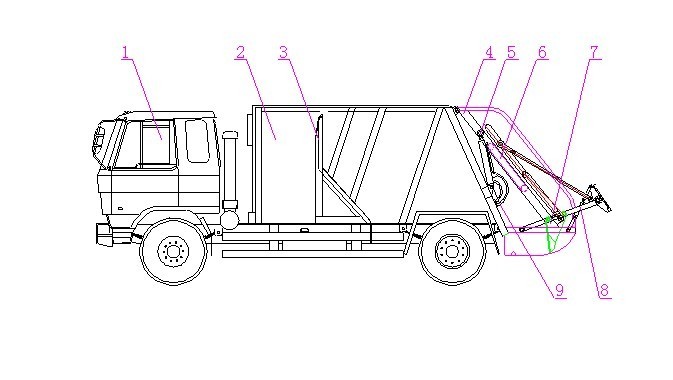 裝料機(jī)構(gòu)由支架,連桿機(jī)構(gòu),凸輪,掛鉤等組成。在油缸作用下,將街頭垃圾桶內(nèi)的垃圾自動(dòng)翻轉(zhuǎn)倒入料斗內(nèi)。